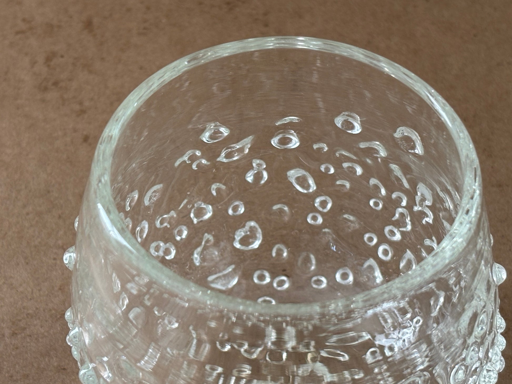 The frozen cups have a texture similar to ice, creating a distinctive feature. Hand blown transparent glass, they possess the ability to absorb and reflect light, doubling as elegant drinking vessel.
